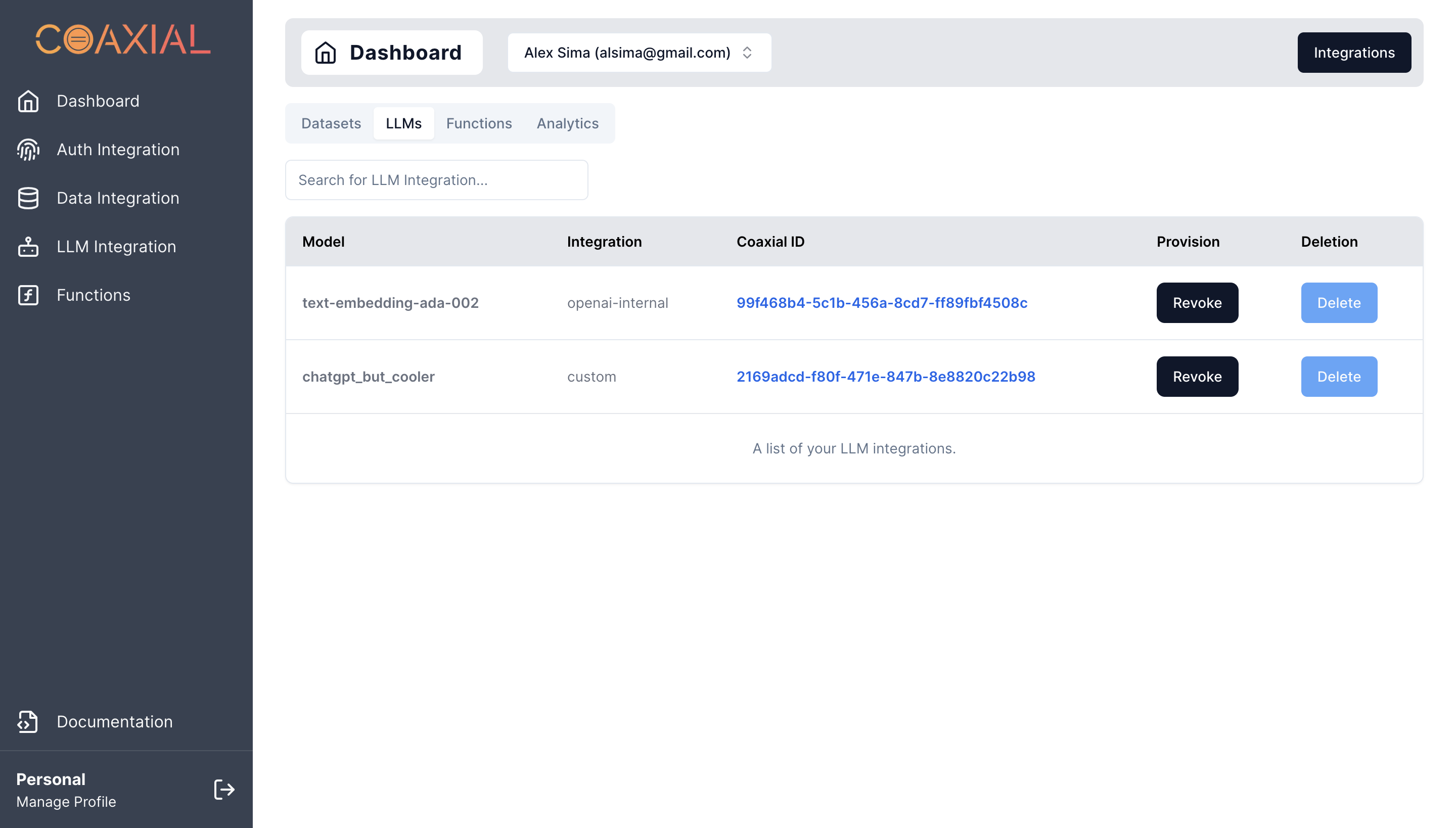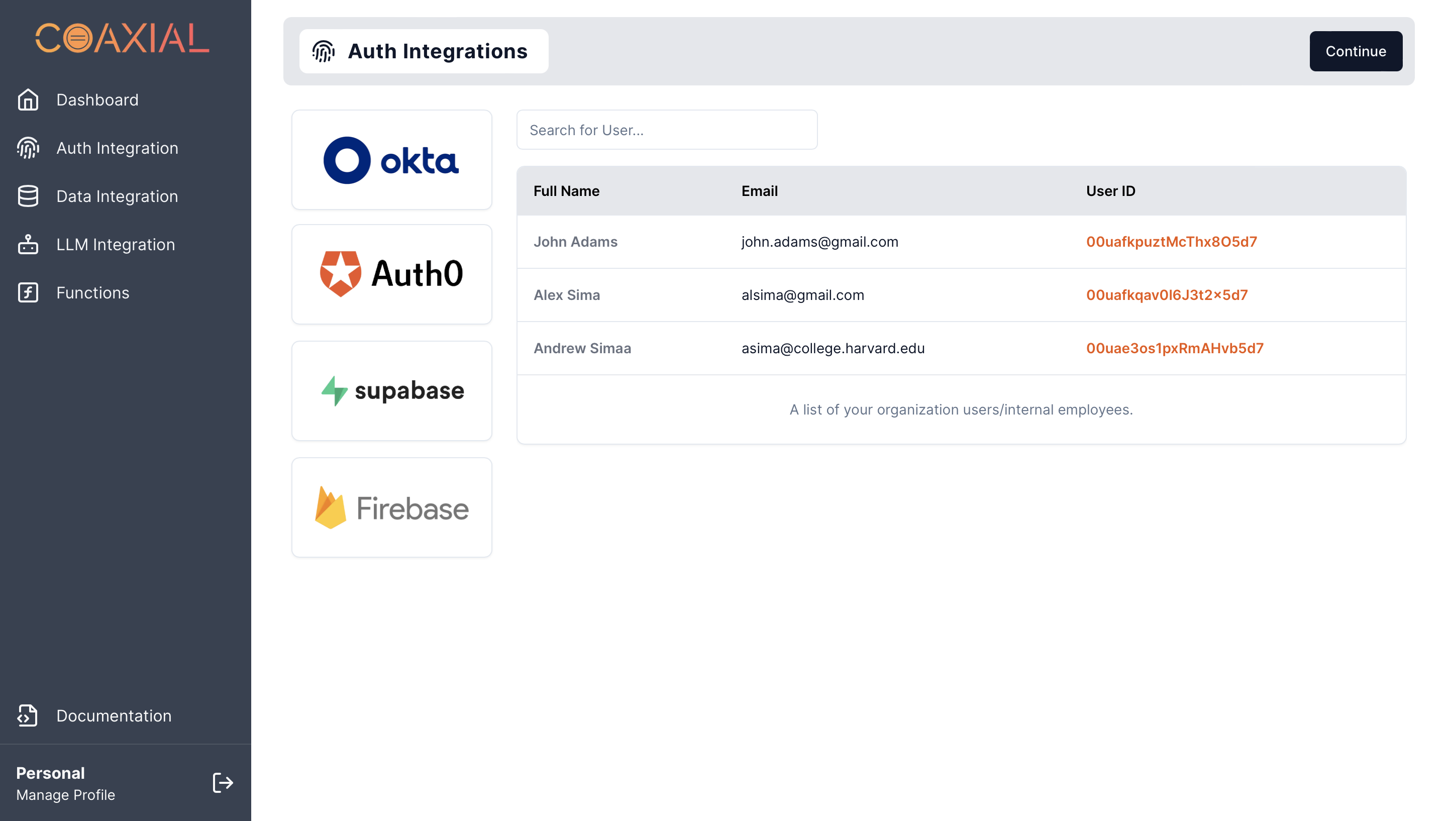 Currently, we do not support public access to Coaxial. If you would like to use Coaxial, please contact our team. Or, schedule a demo. When you onboard Coaxial, you will be given email/password credentials which you can use to log into the Dashboard.Auth Integration