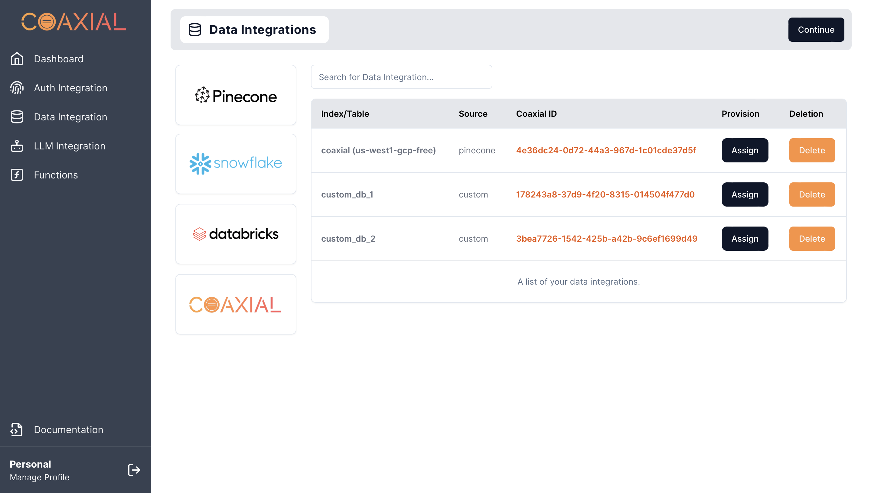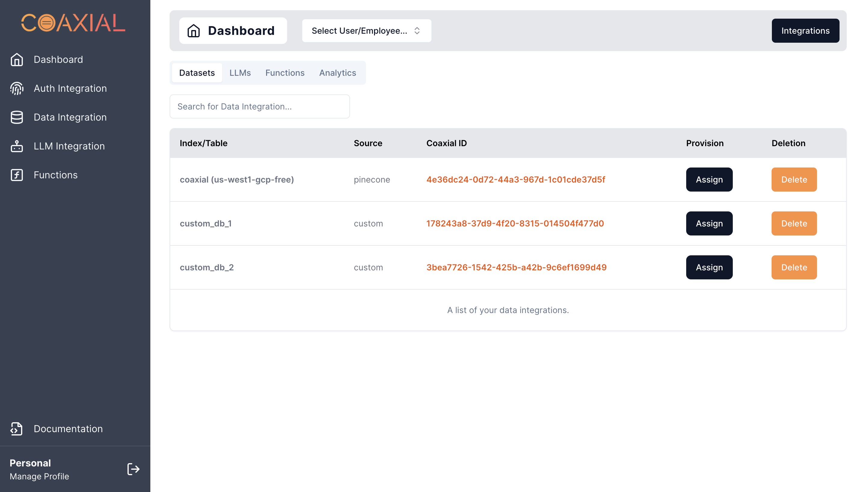 To integrate your data sources, navigate to the “Data Integration” tab. Select an integration from the left and provide the necessary info (client/API keys, index name, etc.) If you wish, you can provision users with access to data integrations using the “Assign” button or remove datasets with the “Delete” button.