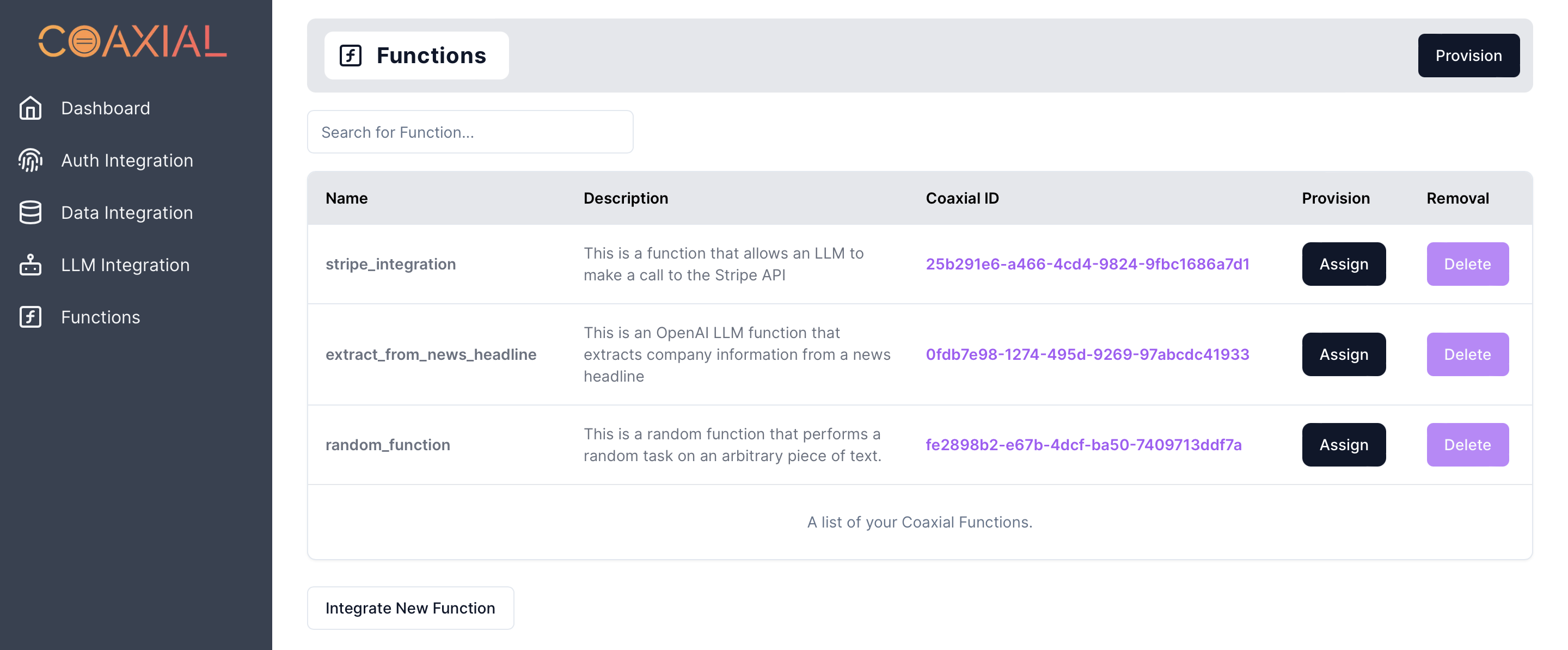 To integrate your functions, navigate to the “Functions” tab. Click the “Integrate New Function” button below the table (we currently only require the function name and description). If you wish, you can provision users with access to functions using the “Assign” button or remove functions with the “Delete” button.