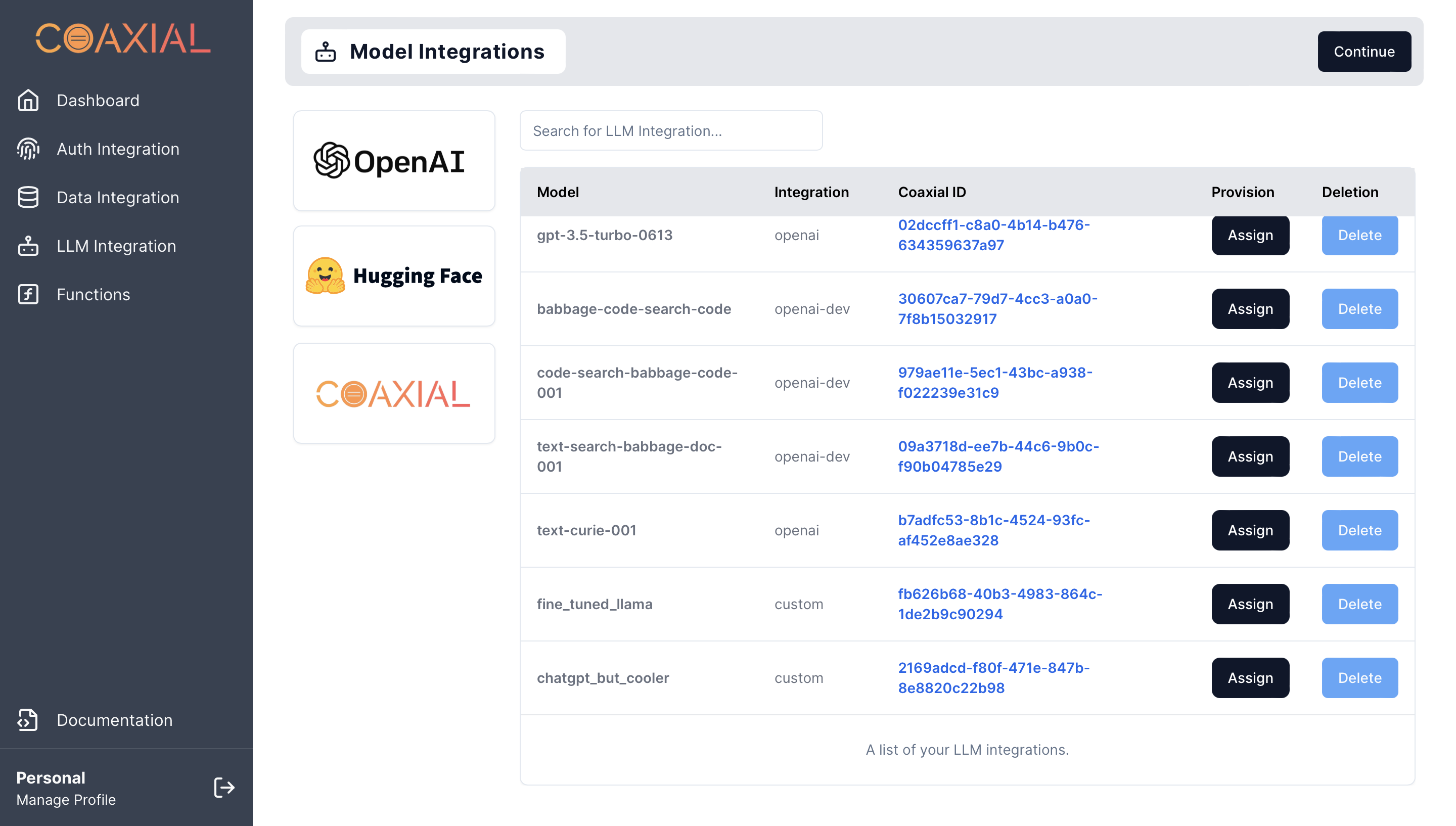To integrate your models, navigate to the “Model Integration” tab. Select an integration from the left and provide the necessary info (client/API keys, model name, etc.) If you wish, you can provision users with access to models using the “Assign” button or remove models with the “Delete” button.